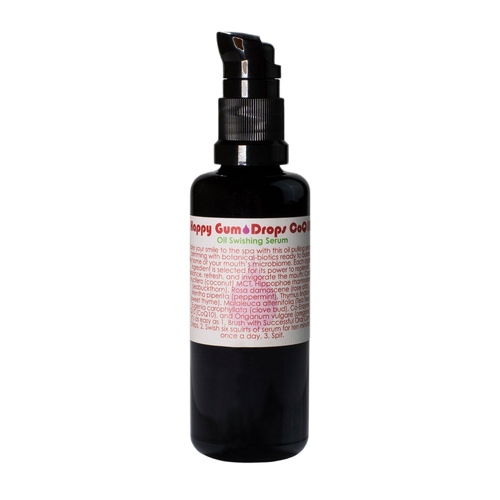 Take your smile to the spa with Living Libations Happy Gum Drops Oil Swishing Serum and anoint your oral ecology with a garland of pure plant botanicals. A natural mouthwash alternative, every ingredient is selected to balance, clean, refresh, and invigorate the mouth. Oil pulling, also known as oil swishing, is all the rage, yet this ancient practice was used by every Ayurvedic Sage. Since time immemorial, oil swishing has been used to achieve healthy teeth and gums without a toothbrush or toothpaste! Simply swish a squirt of these action-ready drops for ten minutes for a deep clean and extra purifying oral care regime. This swishing serum is brimming with botanical-biotics ready to bolster and balance your mouth.