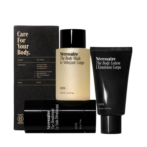 The Body Essentials set contains three award-winning, best-selling minis in Santal. The Body Wash is a Multi-Oil Restorative Cleanse. The Body Lotion is a 2.5% Niacinamide and Multi-Peptide Firming Lotion. The Deodorant is a clean 72-Hour Extra Strength Mandelic Acid Deodorant. No Aluminum. No Baking Soda. No Ozokerite. All 3 formulas in signature scent of Santal. Pure Sandalwood Oil is paired with fine fragrance notes of Black Pepper, Iris and Jasmine for the best in scent. This fine fragrance is developed in partnership with world renowned perfumers. Vegan. TSA-Approved. Dermatologist-Tested. Hypoallergenic. Non-Comedogenic.
